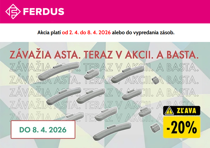 Spoločnosť FERDUS ponúka 20 % zľavu na zinkové závažie ASTA. Akcia platí od 2.4. do 8.4. 2026 alebo do vypredania zásob.