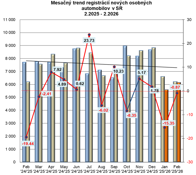 Vo februári 2026 zaznamenal Zväz automobilového priemyslu Slovenskej republiky registrácie nových osobných automobilov s celkovým počtom 6 151 vozidiel. Medziročne predstavujú registrácie nových osobných vozidiel pokles o 0,87%.