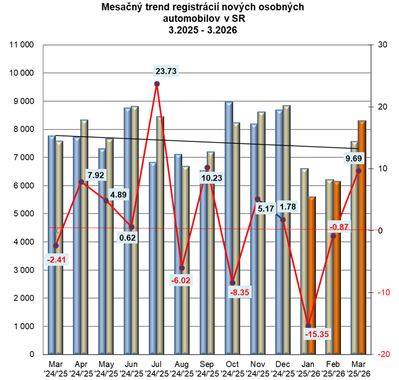 V marci 2026 zaznamenal Zväz automobilového priemyslu Slovenskej republiky registrácie nových osobných automobilov s celkovým počtom 8.300 vozidiel. Medziročne predstavujú registrácie nových osobných vozidiel nárast o 9,69%.