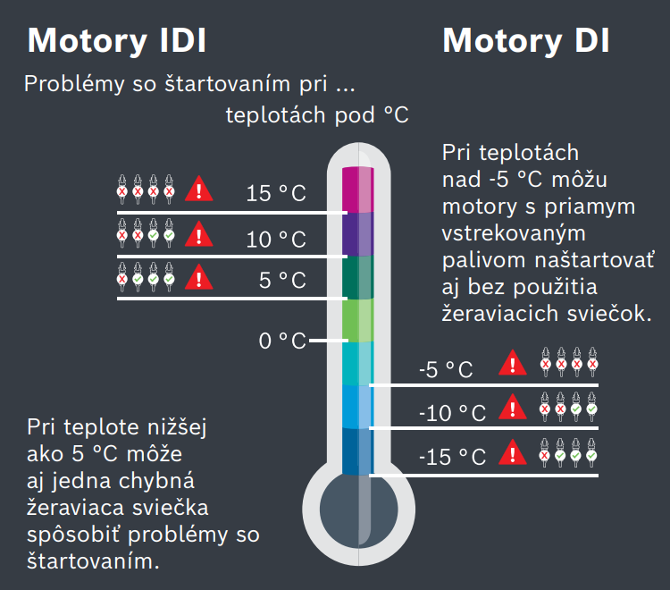 Pri vyšších okolitých teplotách môže studený dieselový motor naštartovať aj s vadnou žeraviacou sviečkou. Avšak s klesajúcou teplotou môže znamenať jedna alebo viac vadných sviečok problém so štartom. Horný obrázok ukazuje, koľko vadných sviečok môže spôsobiť problémy so štartom pri rôznych okolitých teplotách. Vľavo sú motory s nepriamym vstrekom, vpravo motory s priamym vstrekom, čo je väčšina dnešných motorov.