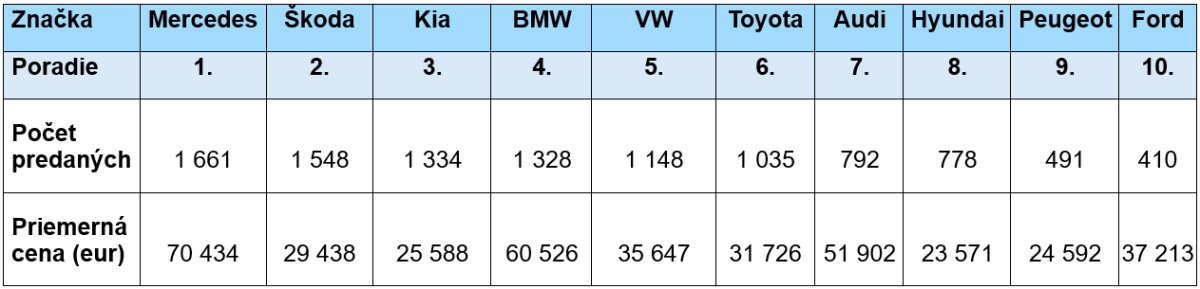 Poradie 10 najpredávanejších značiek v 1. kvartáli 2026 je nasledovné: