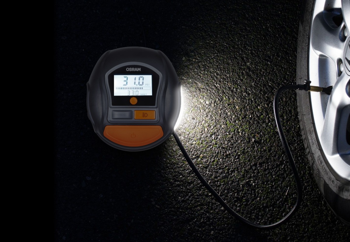 Následne prichádza na rad OSRAM TYREinflate, kompaktný kompresor napájaný zo zásuvky 12 V vo vozidle, ktorý pneumatiku rýchlo nahustí na predpísaný tlak.